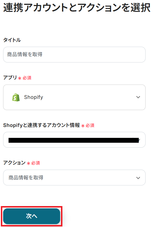 ステップ3と同様、アクションは「商品情報を取得」のまま「次へ」をクリック。