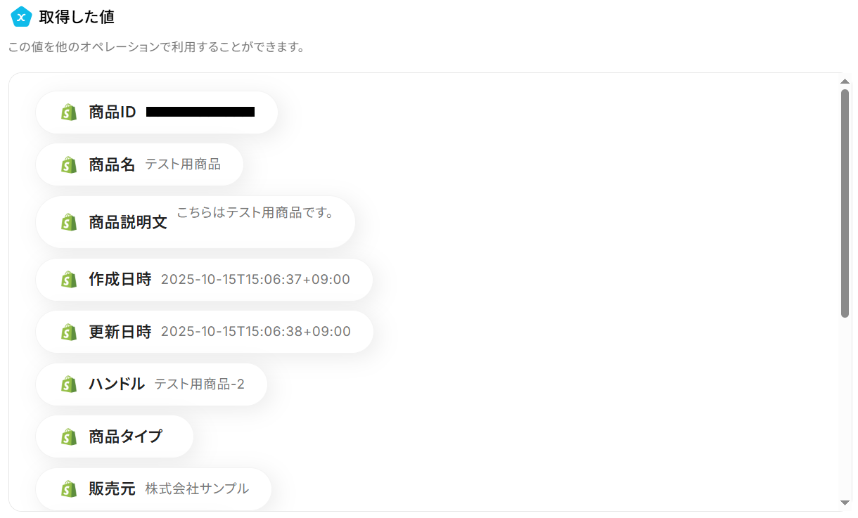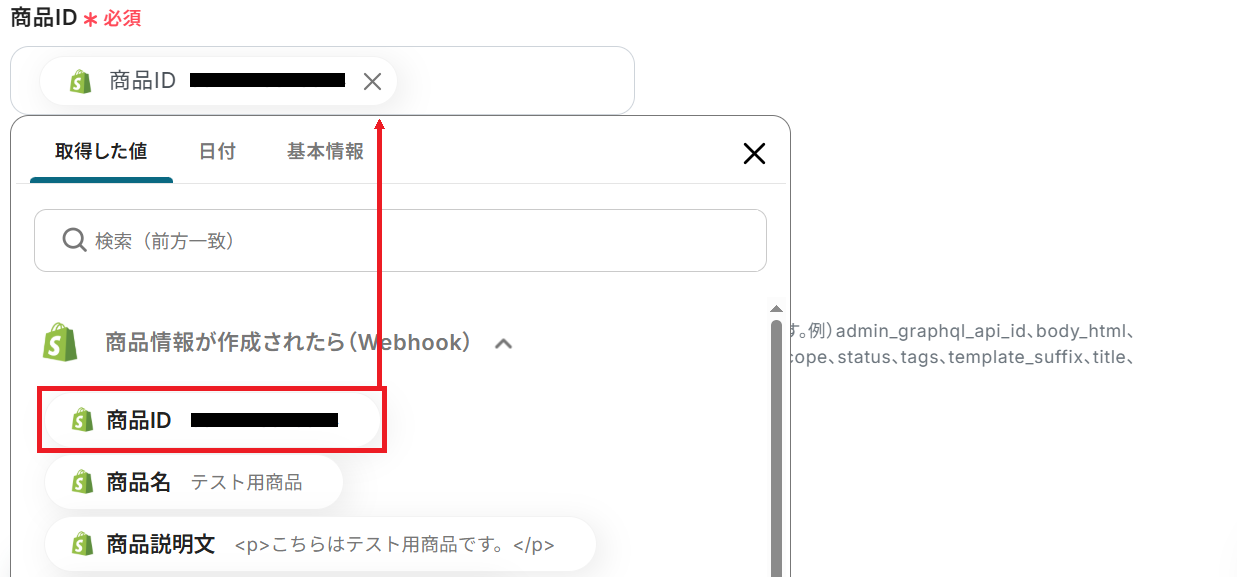 商品IDの欄にはShopifyから取得した「商品ID」の値が予め設定されているので、そのままで大丈夫です。