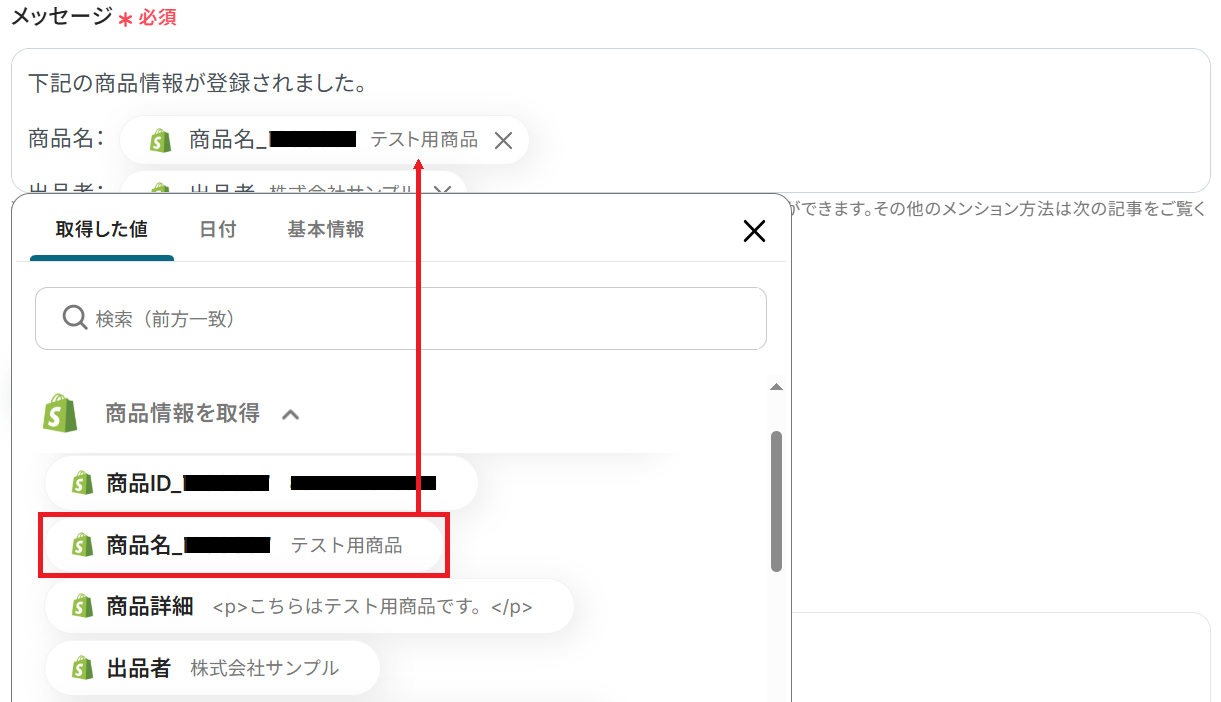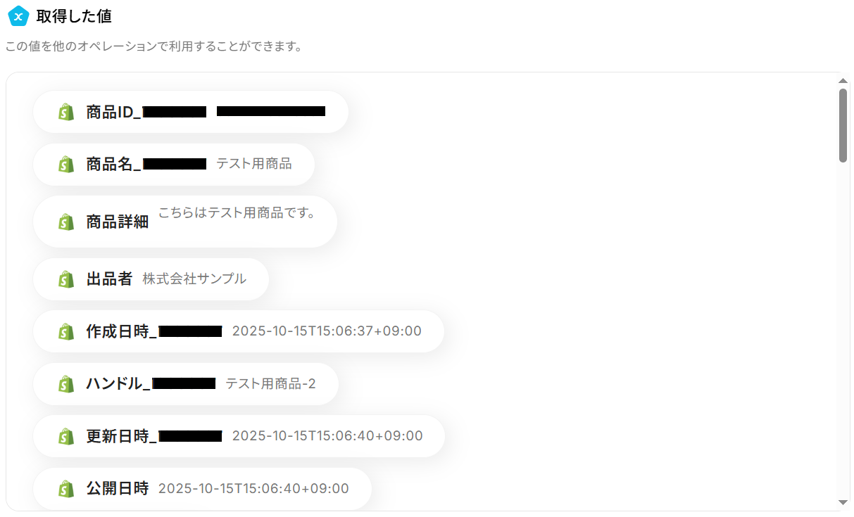 トリガーやオペレーション設定時に「テスト」を実行して取得した値のことです。