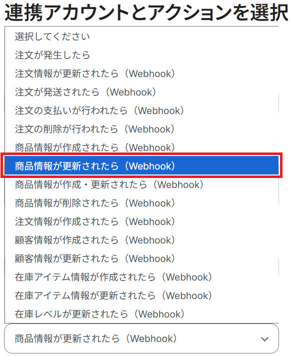 ステップ3の連携アカウントとアクションを選択する画面で、Shopifyのトリガーアクションを「商品情報が更新されたら(Webhook)」に変更した上で設定してください。