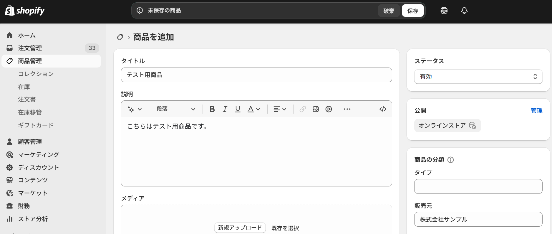 Webhook設定が完了したら、次はテスト用商品を登録します。