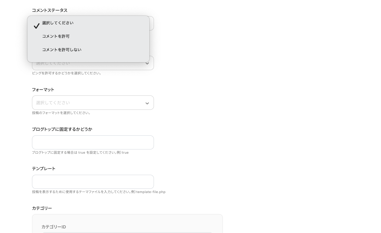 下にスクロールし、「コメントステータス」や「ピングステータス」の部分をプルダウンから選択していきましょう。(設定は任意です。)