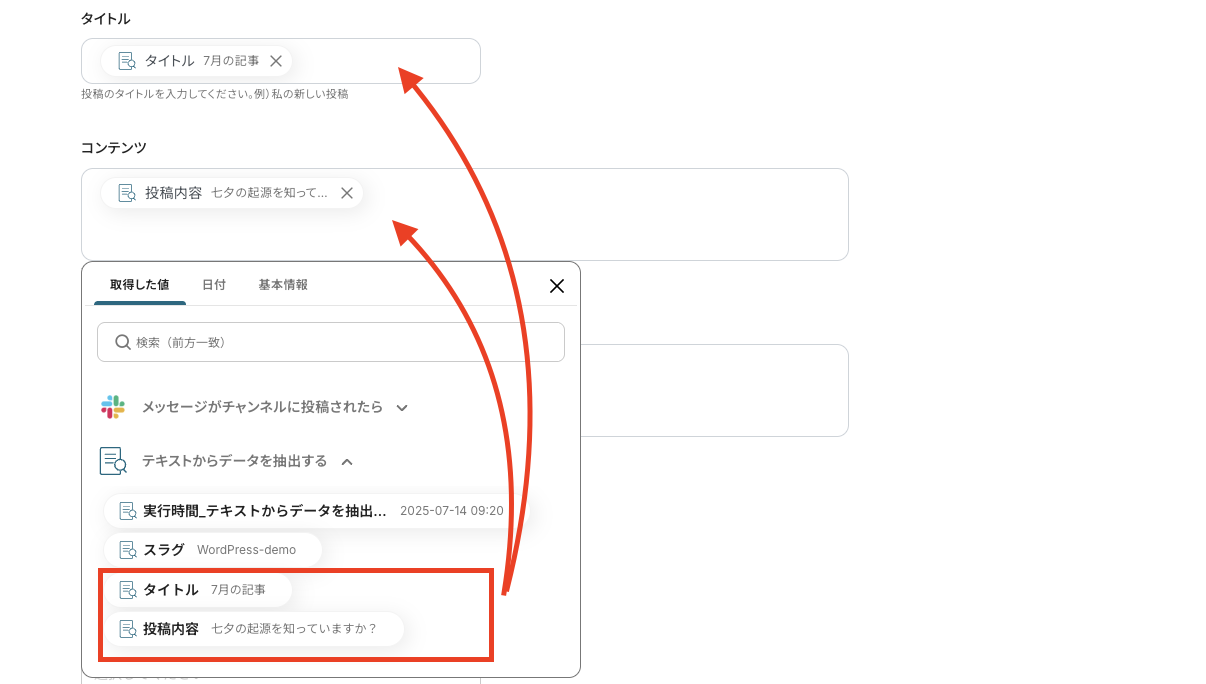 固定値を入力してしまうと、毎回そのテキストから抽出されてしまうので注意してください。