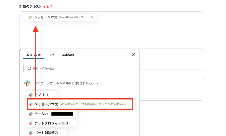 「対象のテキスト」には前ステップから取得した情報を設定しました。