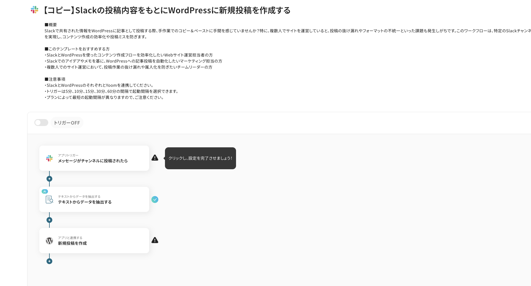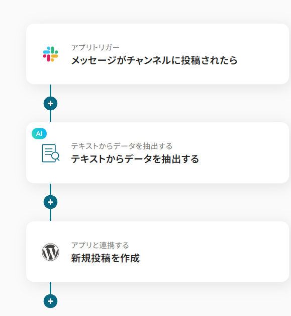「Slackにメッセージが送信されたら、AIで投稿内容を作成しWordPressに下書き保存する」フローは、Slackで受け取ったメッセージを基にAIが自動でブログコンテンツを生成し、WordPressに下書きとして保存する業務ワークフローです。