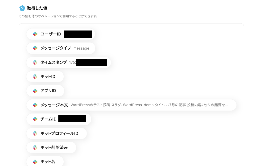 『取得した値』は、「この値を他のオペレーションで利用することができます。」という注釈の通り、この後のステップで引用・活用できます。