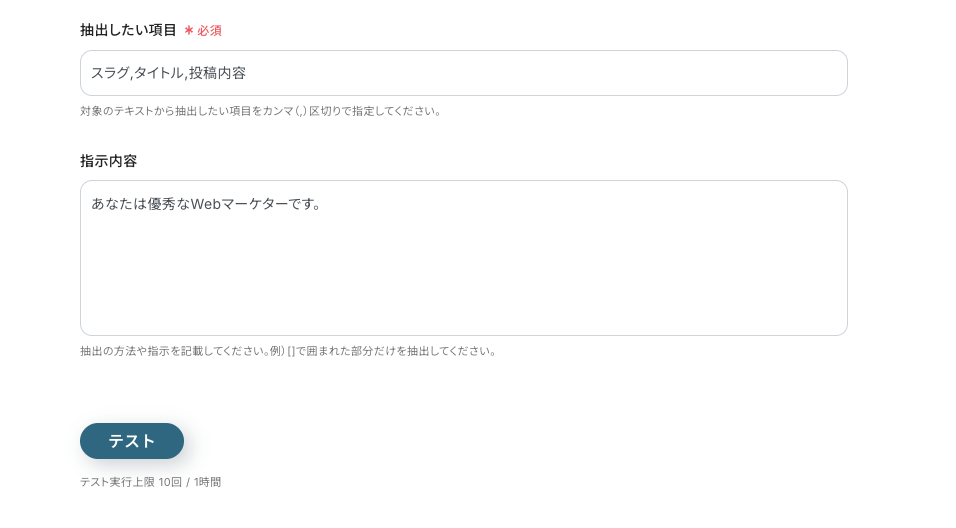 「抽出したい項目」はすでに設定されていますが、カスタマイズ可能な部分なので、「指示内容」も含めて、運用状況に合わせて編集してくださいね。