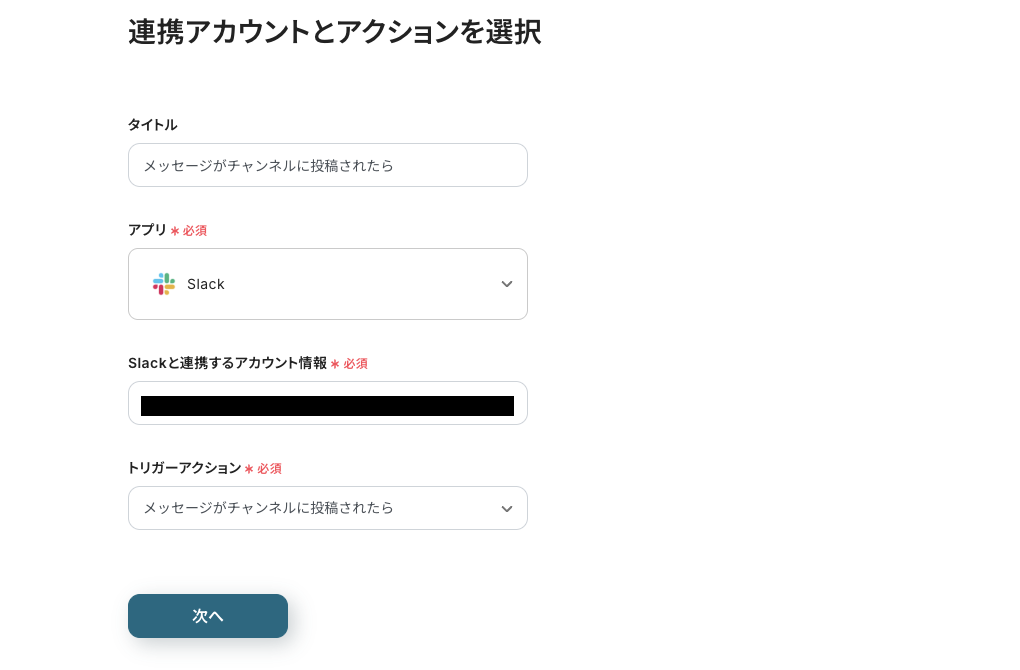 まずは、トリガーとなる「メッセージがチャンネルに投稿されたら」をクリックして、連携するアカウント情報を入力してください。
