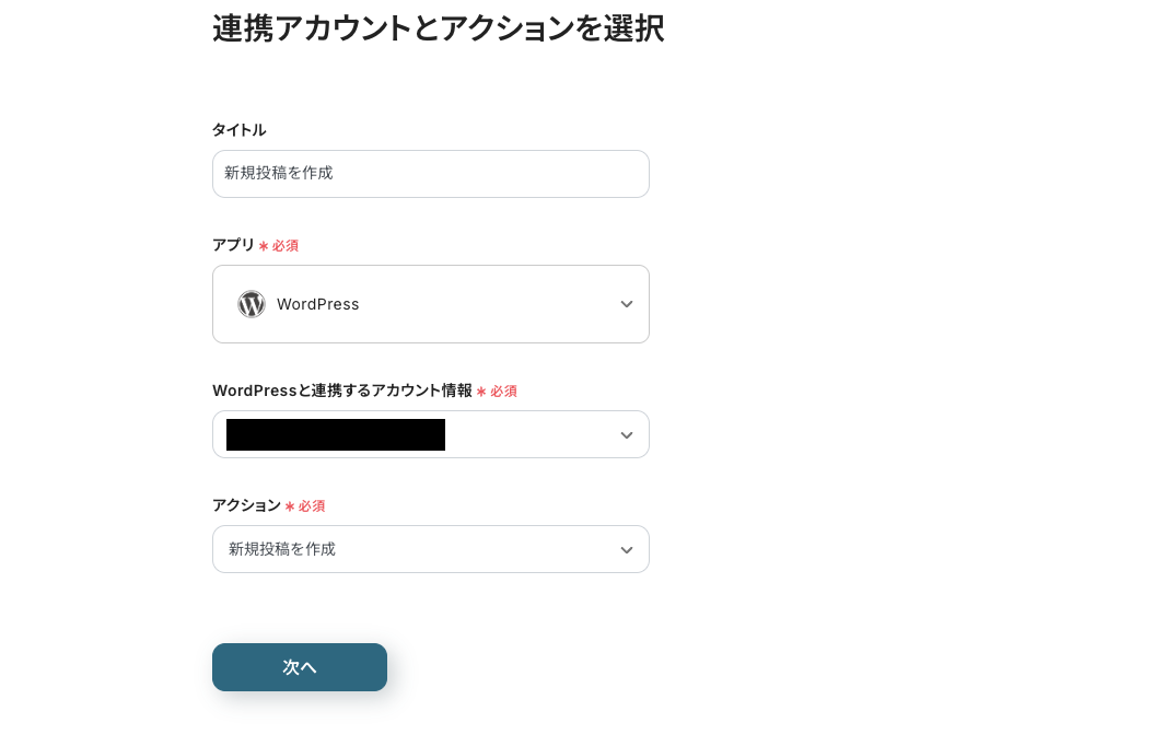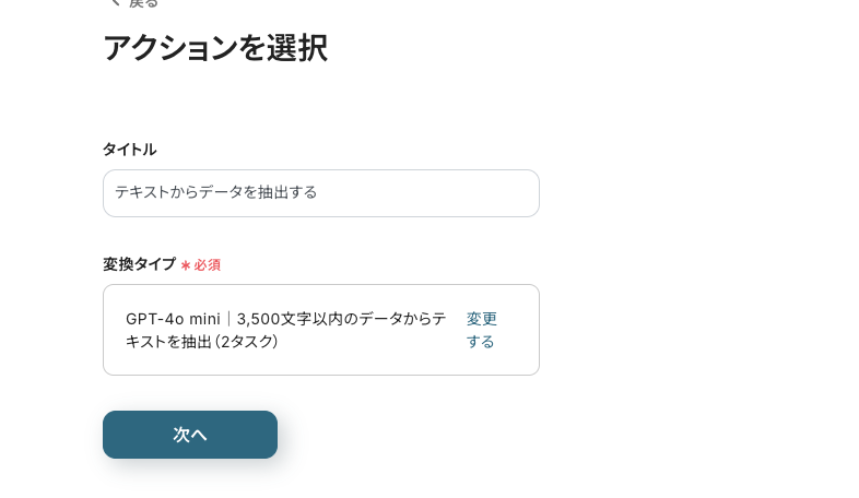 こちらはすでに設定が完了しているアクションなので、内容を確認して[次へ]をクリックしてください。