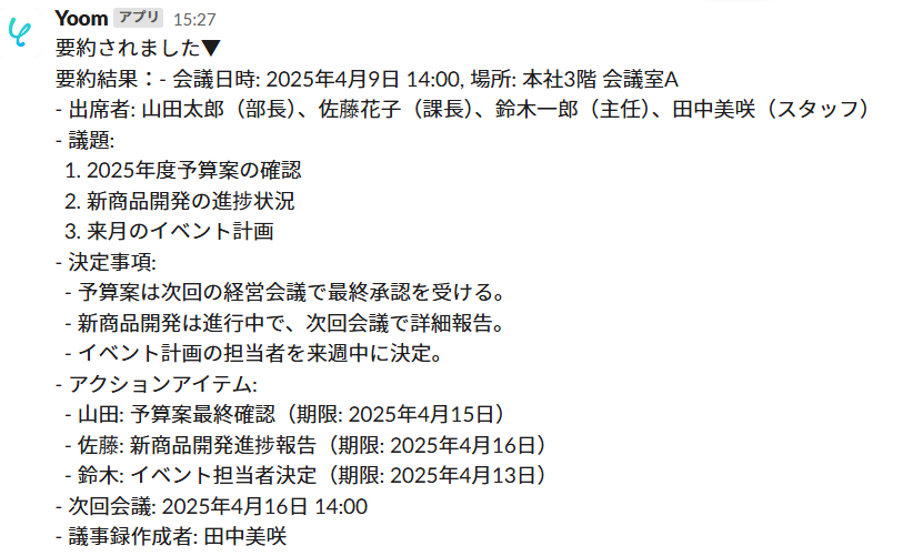 ・要約が自動でスレッドに投稿されるので、重要な情報を見逃してしまうといったコミュニケーション上のリスク軽減に繋がります。