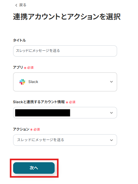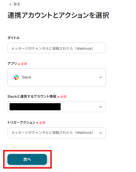 タイトルは任意で変更も可能です。Slackと連携するアカウント情報を確認して「次へ」をクリックします。
