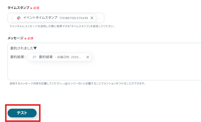 ここまでの設定が完了したら、対象のチャンネルに要約したいメッセージを投稿し「テスト」をクリックします。