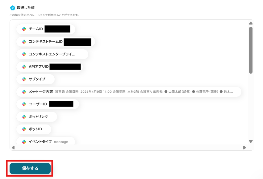 テストに成功するとこのように取得した値の横に詳細が表示されるので「保存する」をクリックしてください。