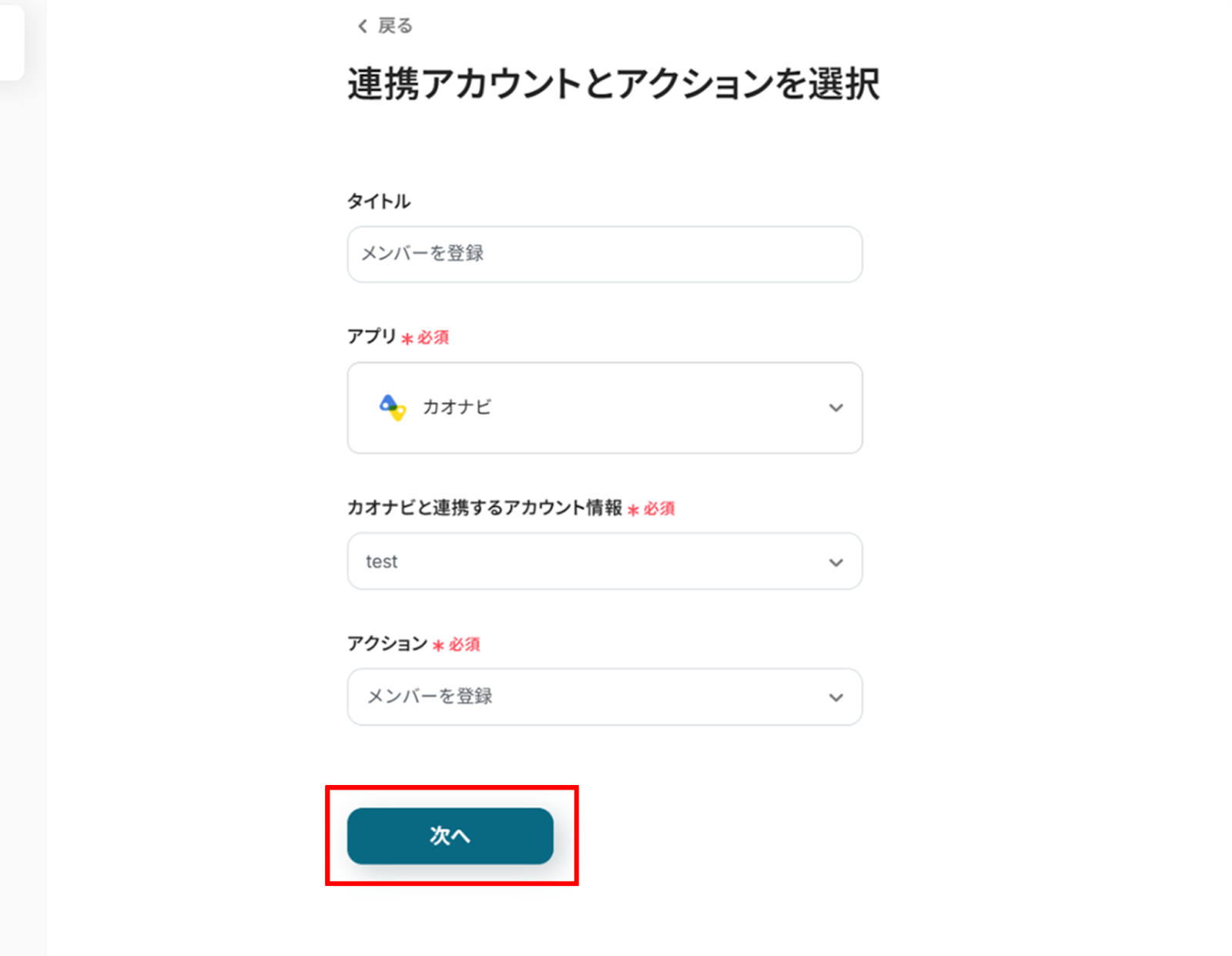 (2)カオナビの「連携アカウントとアクションを選択」画面から、カオナビと連携するアカウント情報に誤りがないかを確認し、アクションは「メンバーを登録」のままで「次へ」をクリックします。