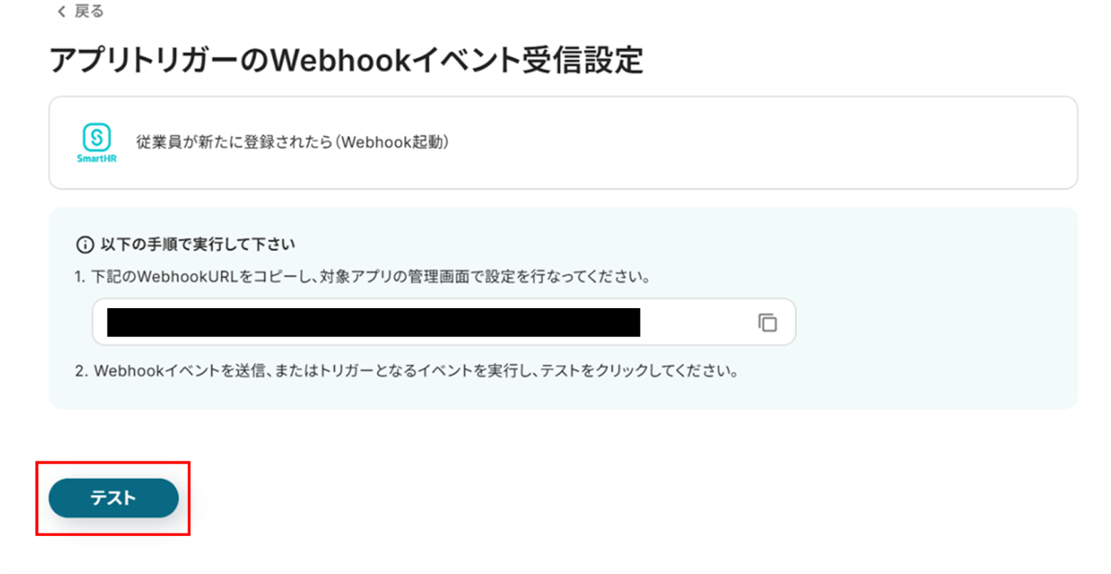 (3)「アプリトリガーのWebhookイベント受信設定」画面から赤枠を確認の上、WebhookURLをコピーし、SmartHRの管理画面で設定を行なってください。