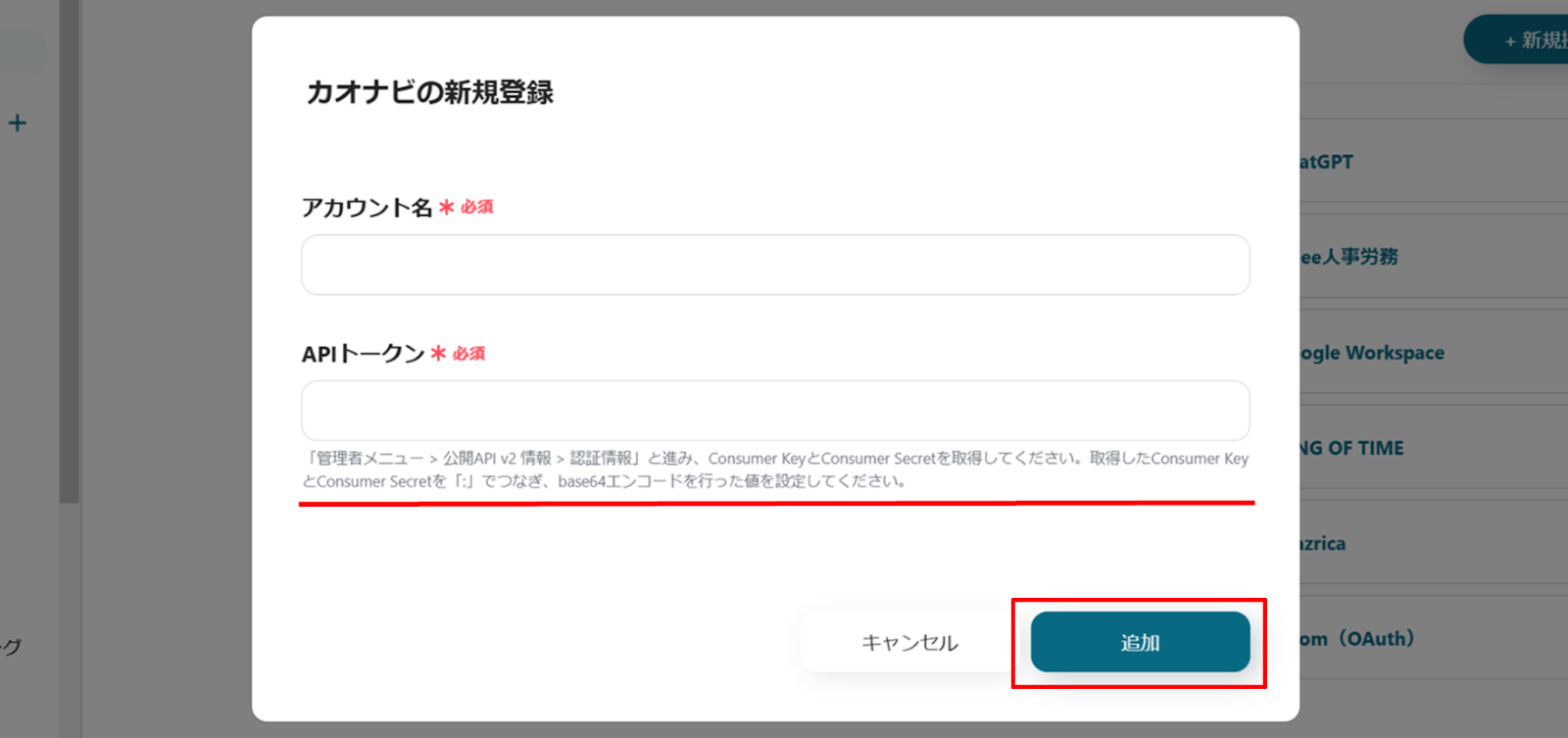 「カオナビの新規登録」画面から、赤線を確認の上、アカウント名、APIトークンを入力します。