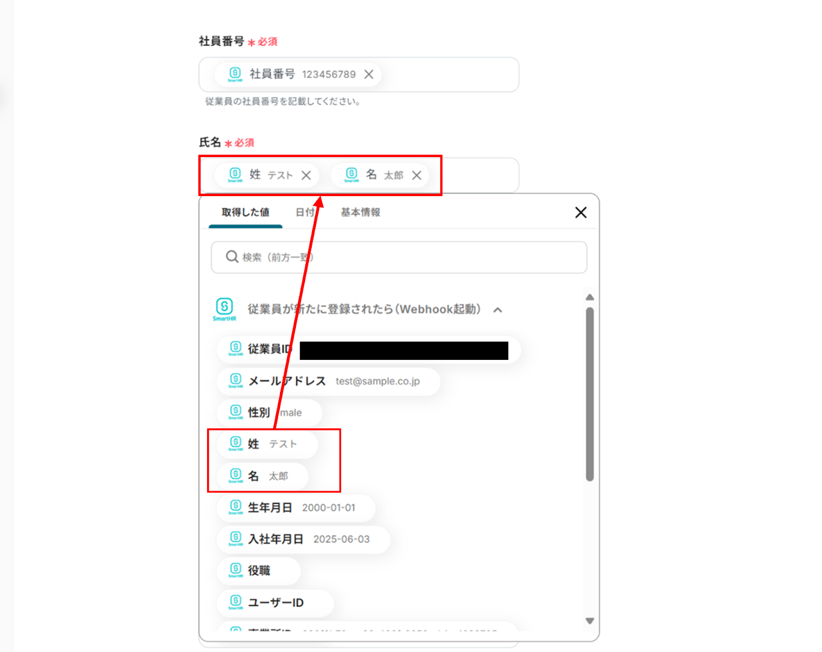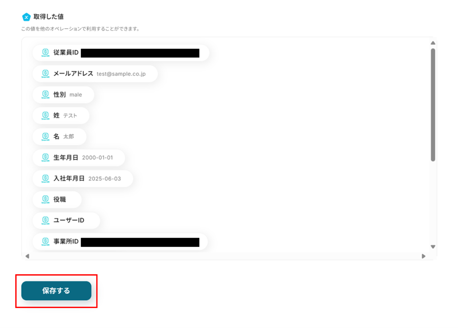 (4)「取得した値」にSmartHRの情報が反映されればテスト成功です。