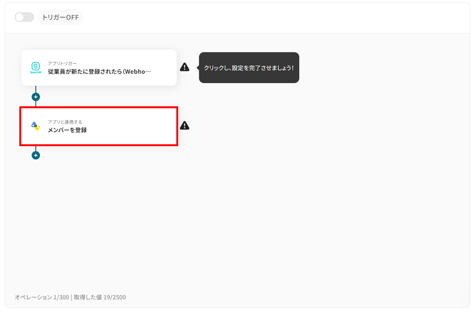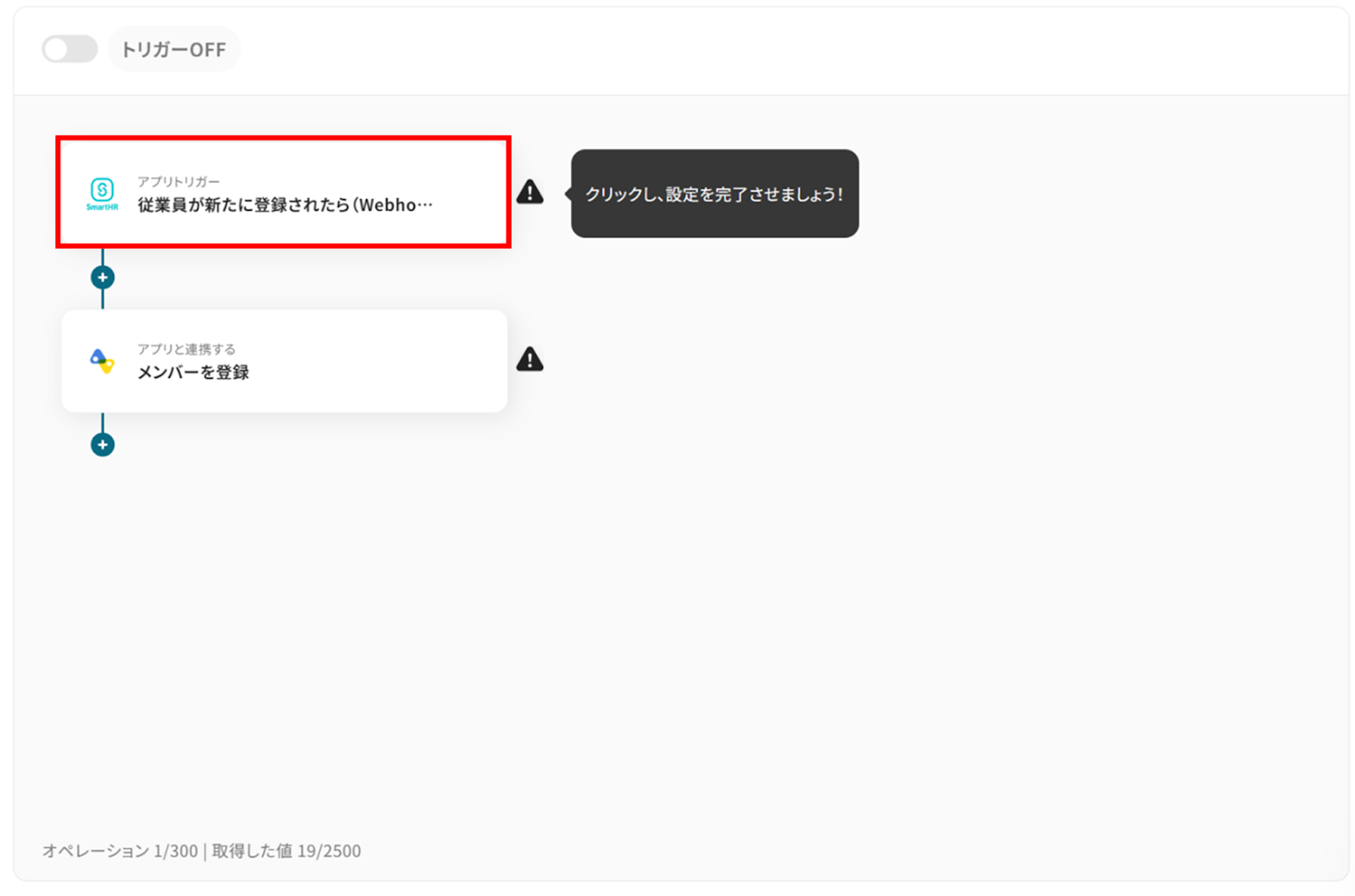 (1)アプリトリガーの「従業員が新たに登録されたら(Webhook起動)」をクリックします。