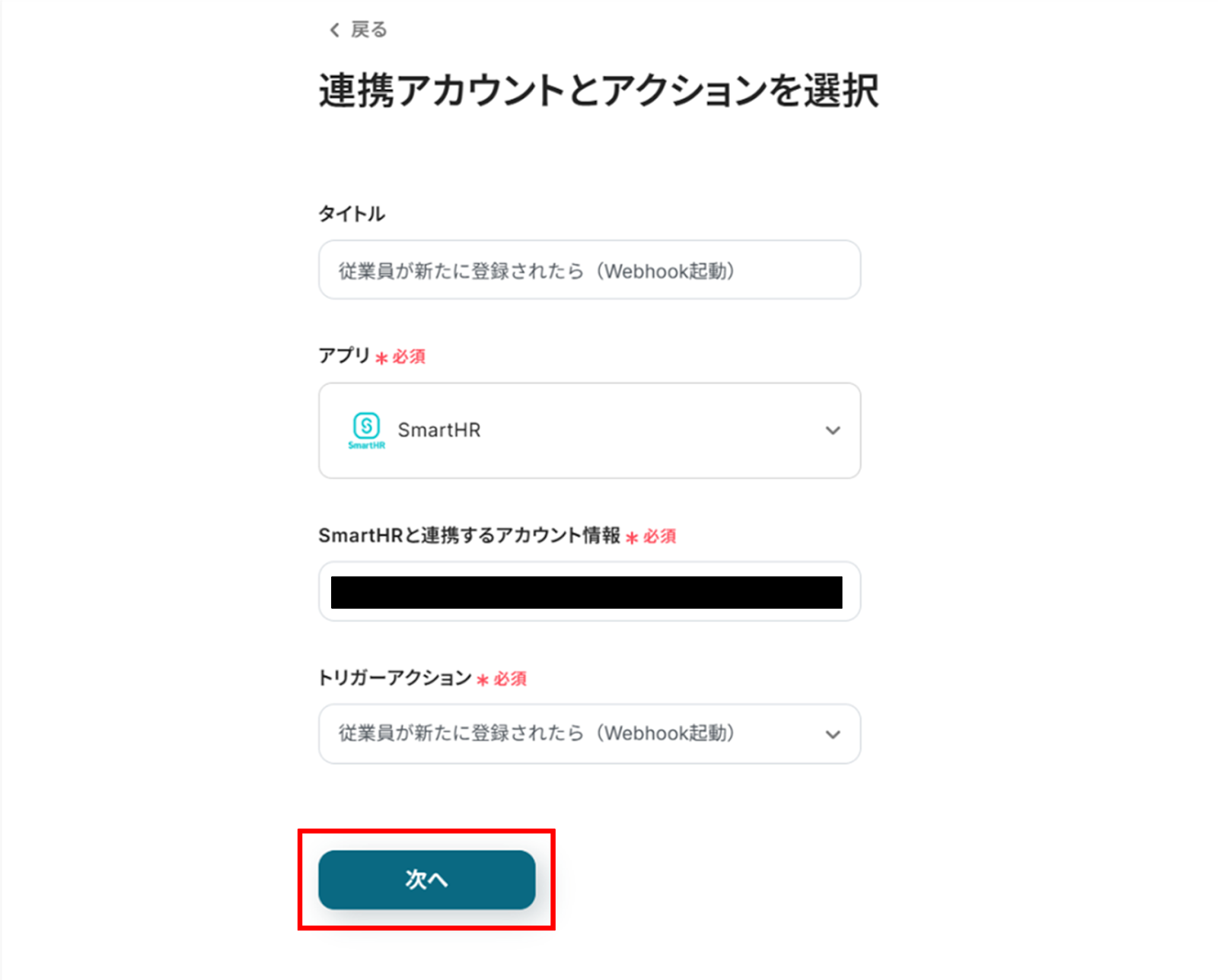 (2)SmartHRの「連携アカウントとアクションを選択」画面から、SmartHRと連携するアカウント情報に誤りがないかを確認し、トリガーアクションは「従業員が新たに登録されたら(Webhook起動)」のままで「次へ」をクリックします。