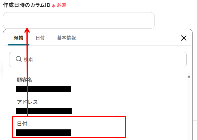 - 作成日時のカラムID:こちらも入力欄をクリックして、作成日時を選択しましょう。