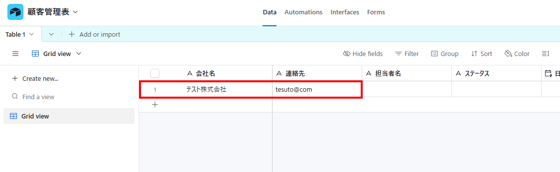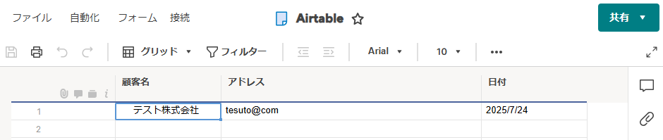 なお、この後のテスト操作ために、カラムに日付を作成し、テスト用に行を1つ追加してください。(内容はテスト株式会社などの架空の情報でOKです)