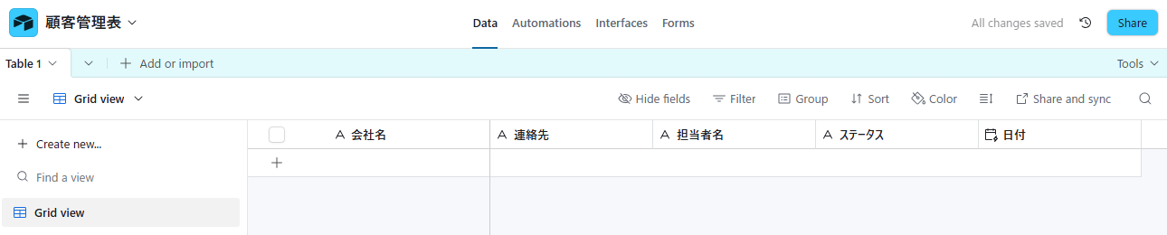 事前準備として、データの追加先となるAirtableの表をあらかじめ用意しておきましょう。