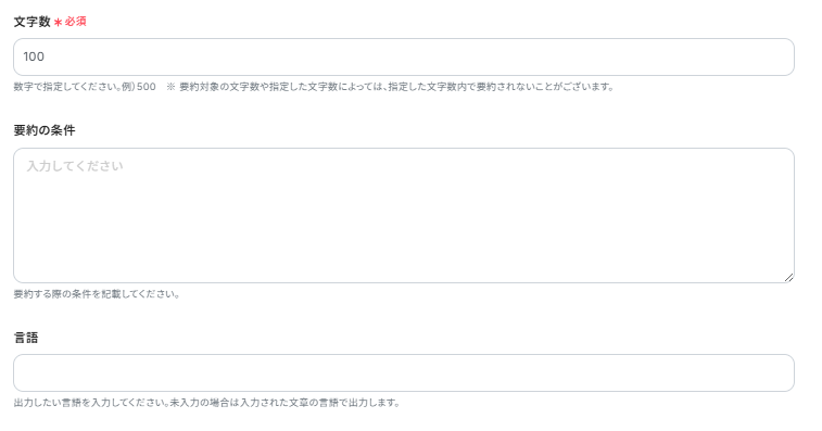 例としては「箇条書きにしてください」や「500文字以内にしてください」など、どのような要約を行いたいのか記載するのがおすすめです。