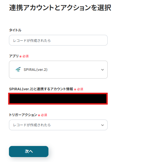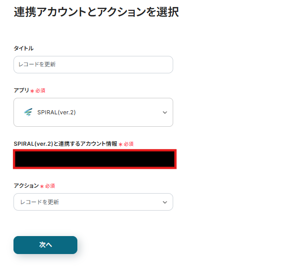 連携アカウントとアクションを選択する画面が表示されるので、今回連携するSPIRALのアカウントを確認し「次へ」をクリックします。