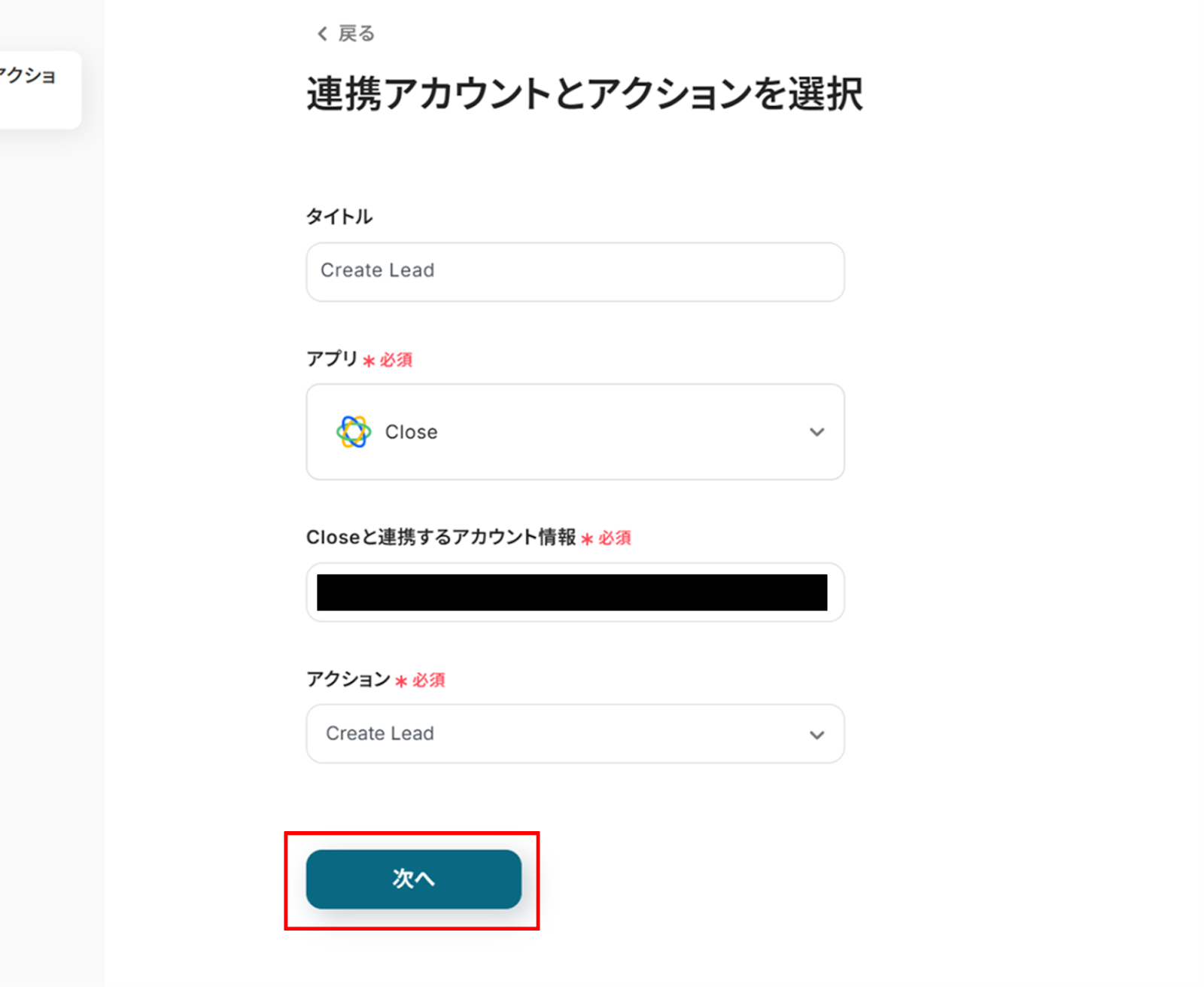 (2)Closeの「連携アカウントとアクションを選択」画面から、Closeと連携するアカウント情報に誤りがないかを確認し、アクションは「Create Lead」のままで「次へ」をクリックします。