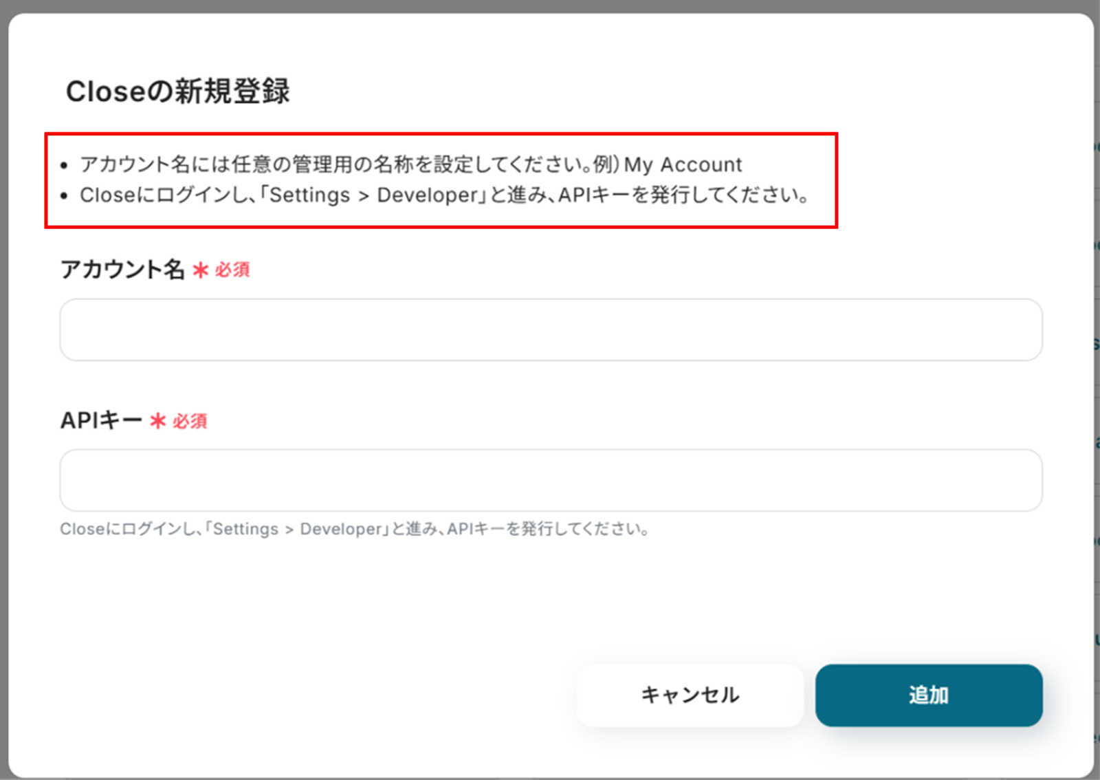 「Closeの新規登録」画面から赤線を確認の上、アカウント名、APIキーを入力し「追加」をクリックしましょう。