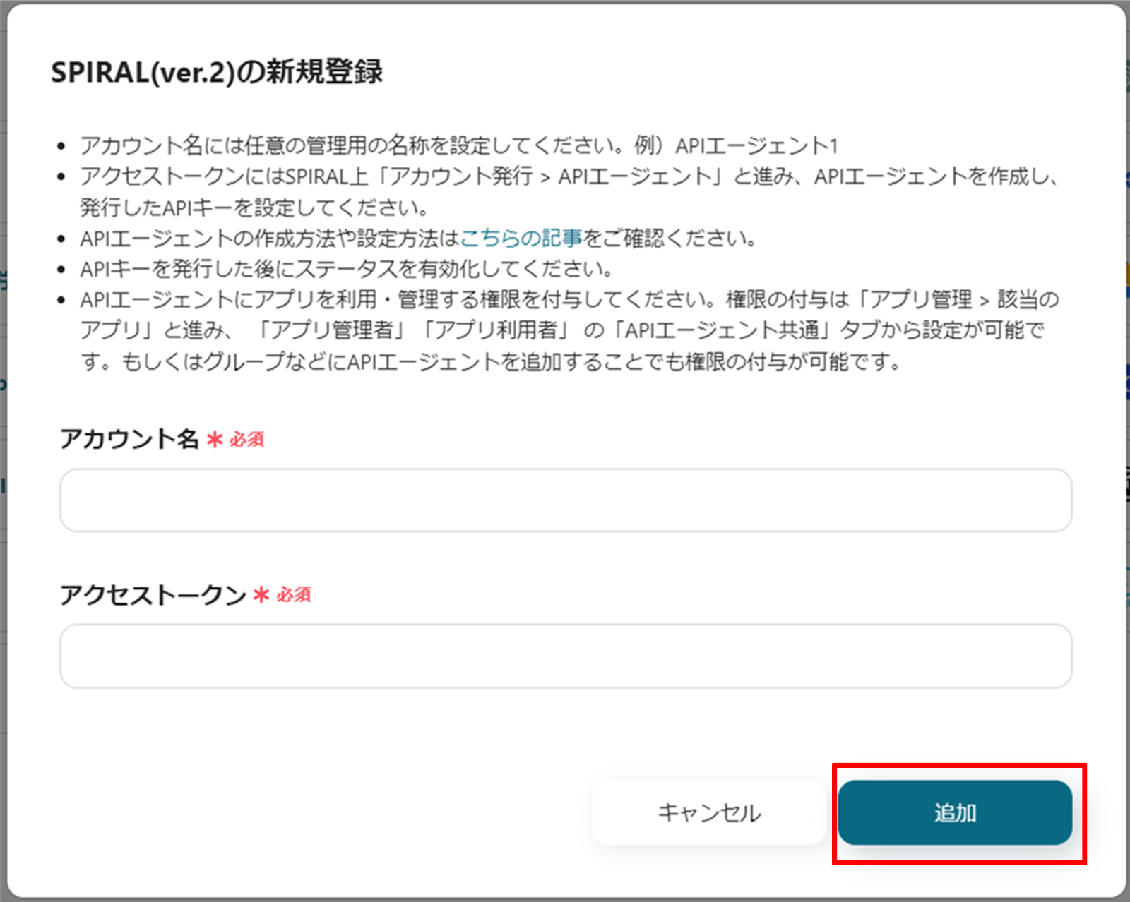 (2)SPIRALの新規登録画面から、アカウント名、アクセストークンを入力します。