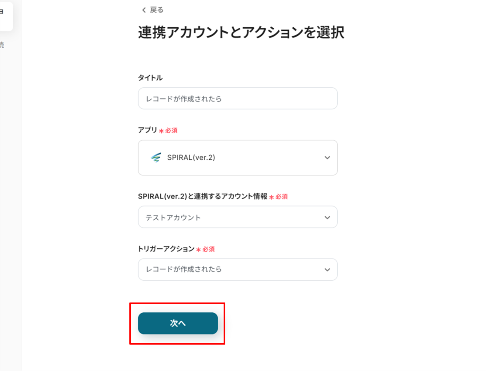 (2)SPIRALの「連携アカウントとアクションを選択」画面から、SPIRALと連携するアカウント情報に誤りがないかを確認し、トリガーアクションは「レコードが作成されたら」のままで「次へ」をクリックします。