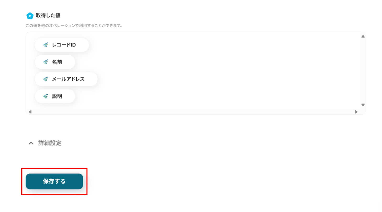 また、テストが成功しても自動で項目が表示されない場合は「+取得する値を追加」をクリックして回答データを取得しましょう。