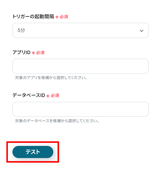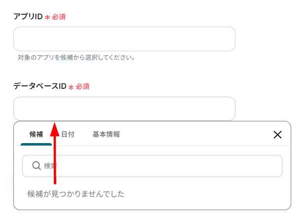 レコードを作成するアプリとデータベースのIDを候補から設定してください。