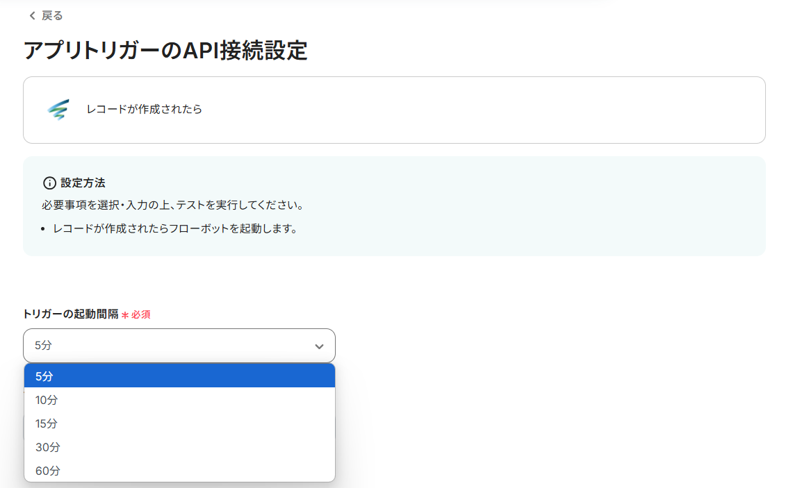 - トリガーの起動間隔は、選択した時間毎に一度、SPIRALでトリガーとなるアクション(レコードの作成)が行われたかを確認し、アクションが行われている場合にフローボットが起動します。