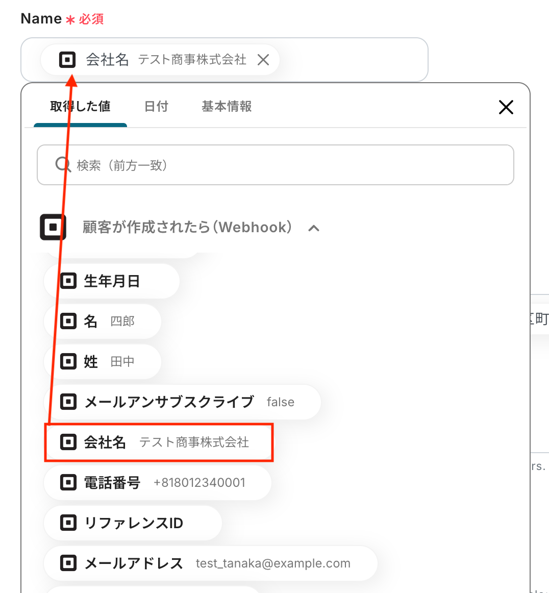 Name クライアントとして作成する顧客の名前を入力します。 入力欄をクリックすると、前のステップでSquareから取得済みのアウトプットが表示されるので、選択して入力しましょう。 アウトプットを活用することで値が固定化されず、フローボットを起動するたびに最新の情報を自動で反映できます。 ※なお、テキストを直接入力した部分は固定値とされるため、アウトプットを活用せず設定を行うと毎回同じデータがHarvestに登録されてしまうので注意が必要です。