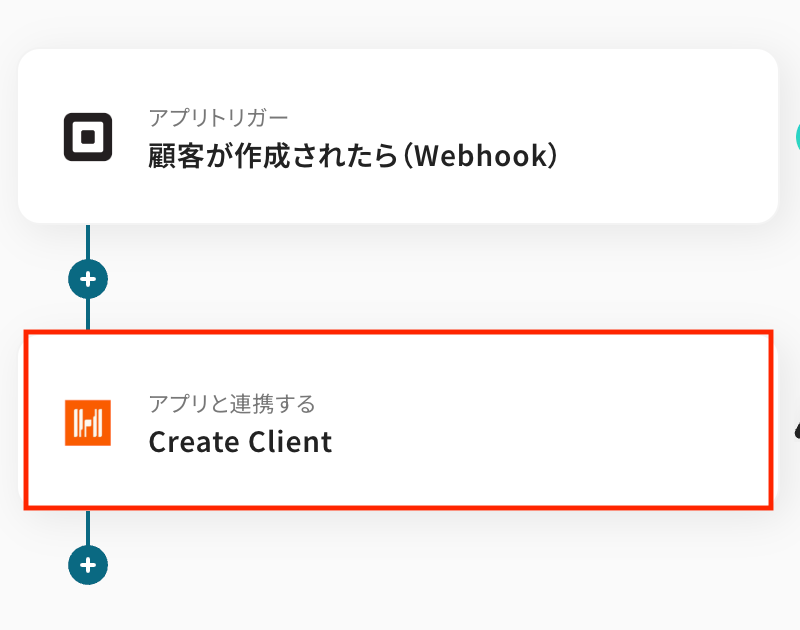 はじめに、SquareとHarvestをYoomと連携します 次に、トリガーでSquareを選択し、「顧客が登録されたら」というアクションを設定します 最後に、オペレーションでHarvestを選択し、「Create Client」のアクションで、Squareから取得した顧客情報を基にクライアントを作成するよう設定します ※「トリガー」:フロー起動のきっかけとなるアクション、「オペレーション」:トリガー起動後、フロー内で処理を行うアクション