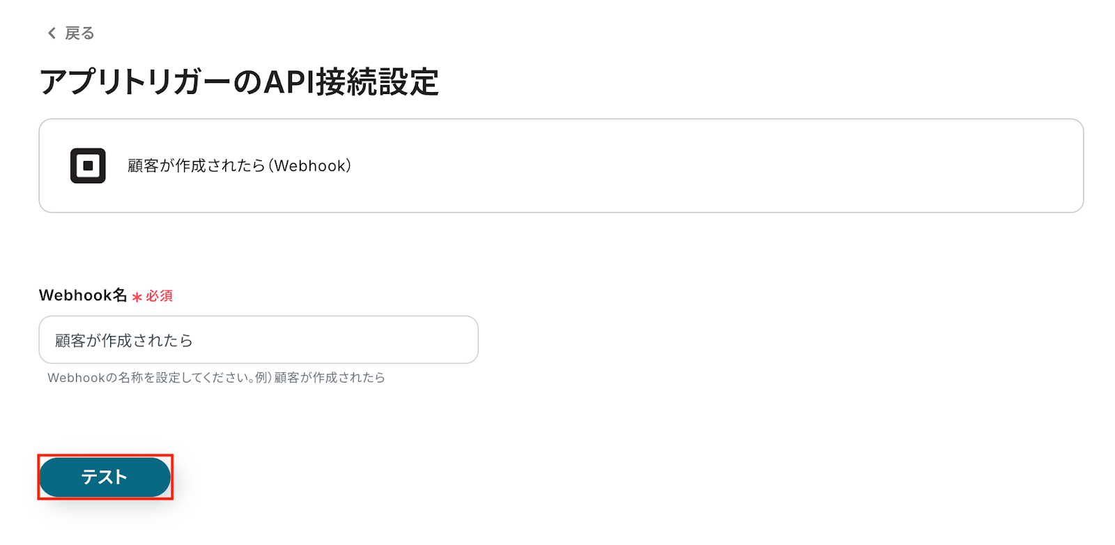 Squareで顧客が新たに作成された際に連携を開始するためのWebhookトリガーを設定します。 正しくトリガーが動作するかを確認するため、任意のWebhook名を設定後、「テスト」をクリックしてください。