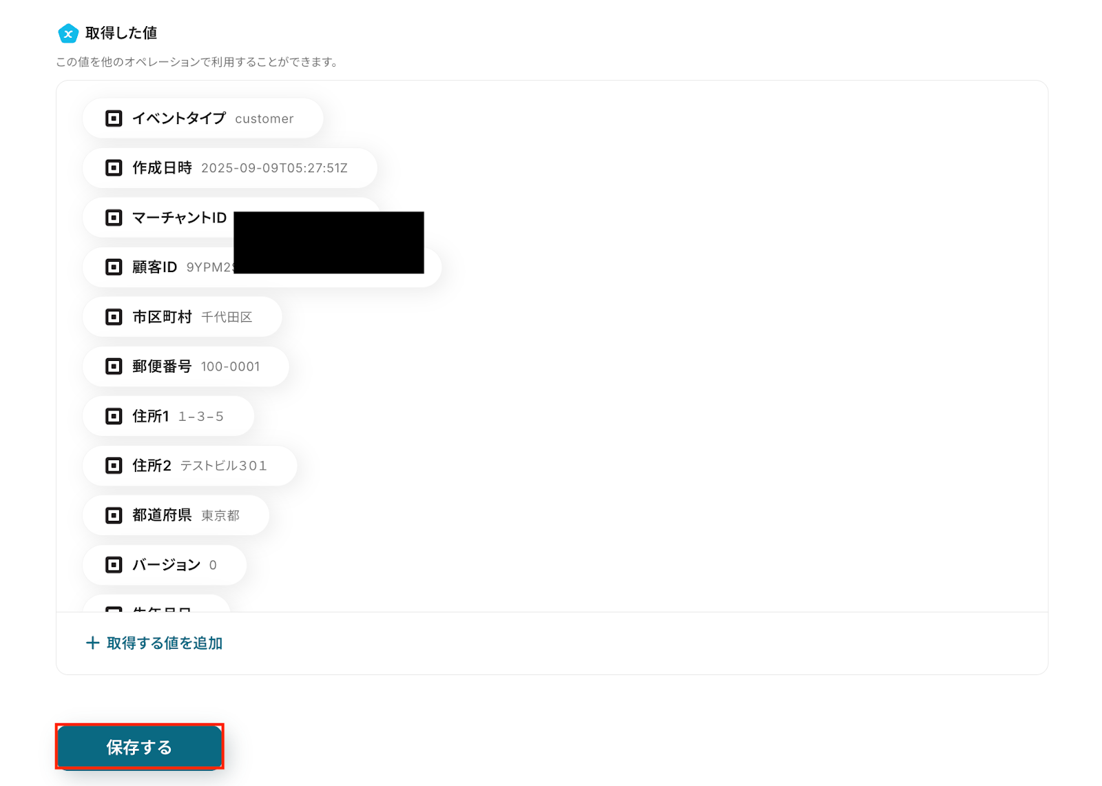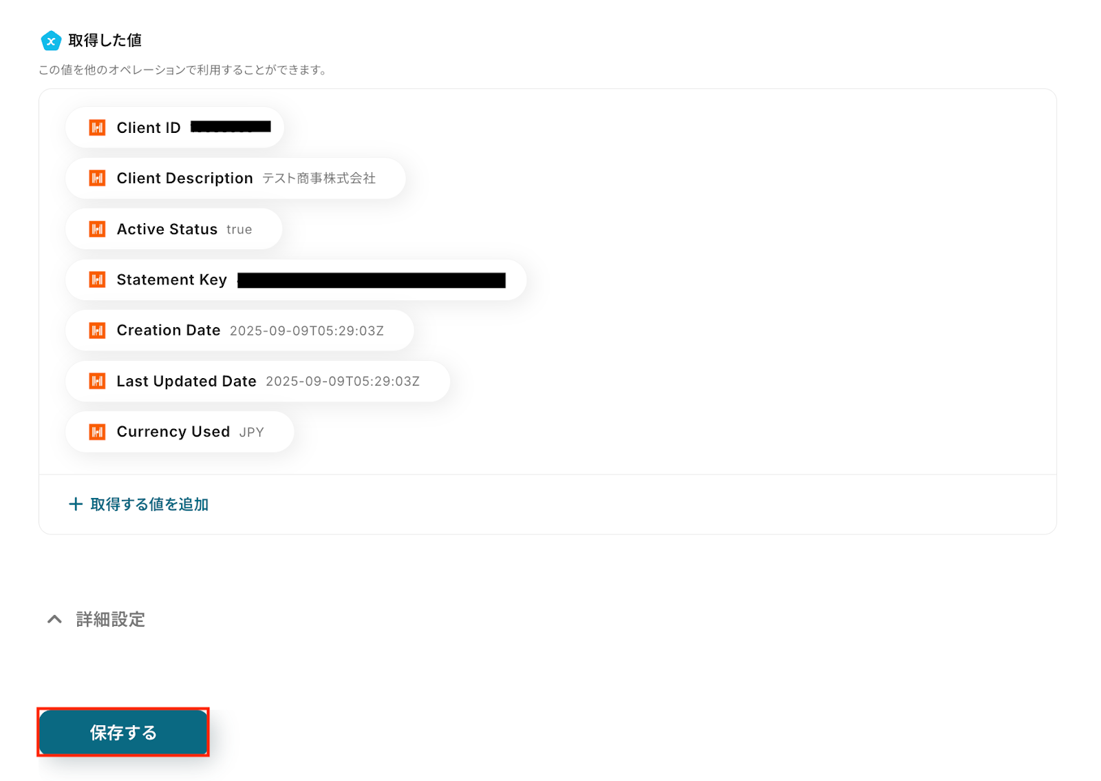 問題がなければYoomの操作画面に戻り、取得した値を確認し「保存する」をクリックします。 以上ですべての設定が完了しました!