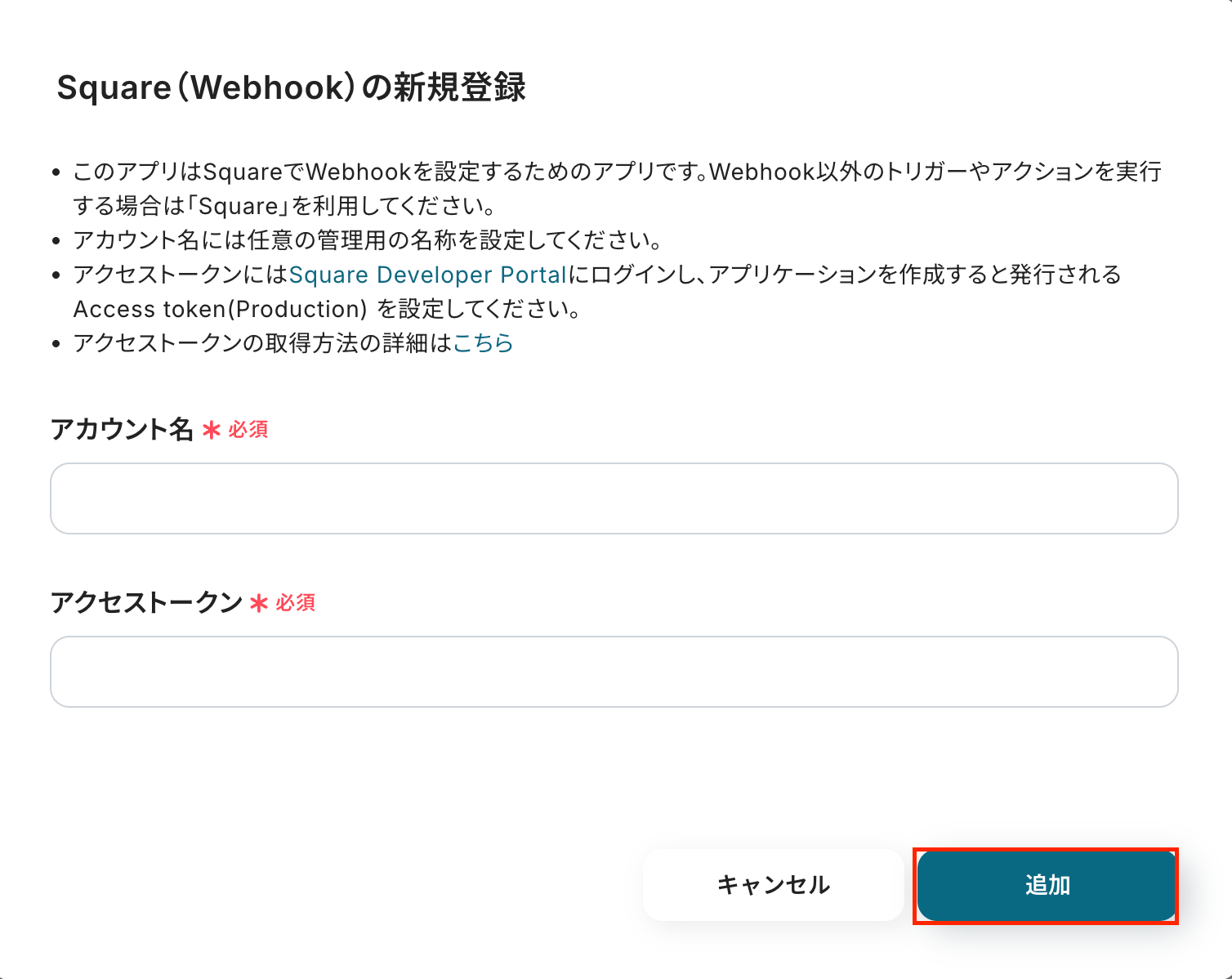 以下の画面が表示されるので、アカウント名とアクセストークンを注釈に沿って入力し、「追加」をクリックしましょう。