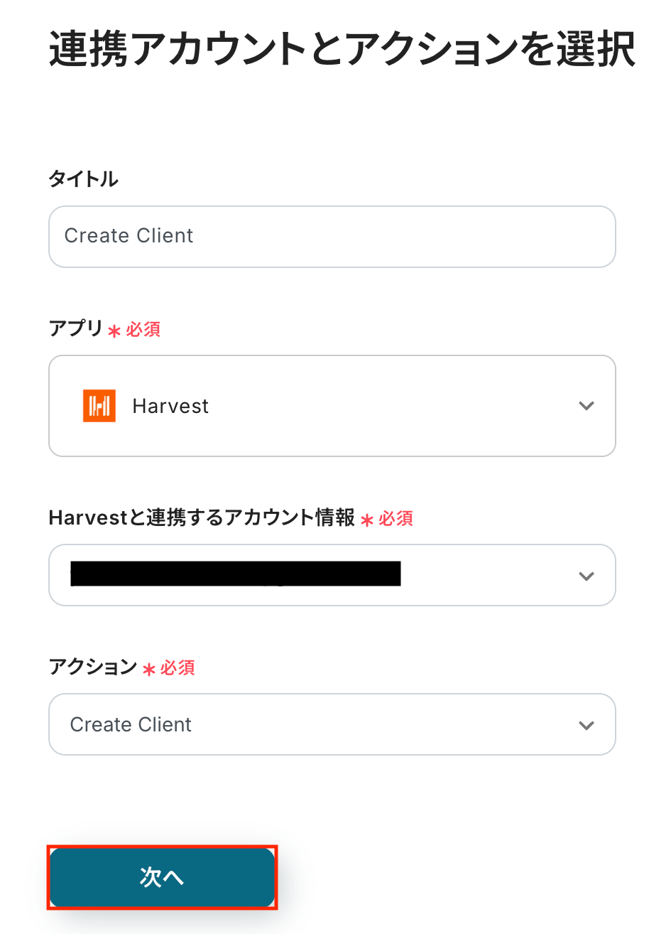 Harvestと連携するアカウント情報に問題がなければ、「次へ」をクリックします。