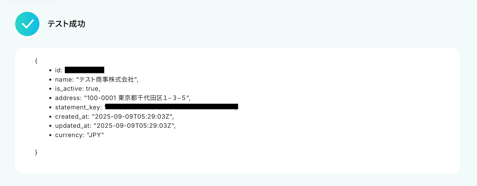 SquareとYoomのWebhook連携が正しく接続されている場合、以下の通り「テスト成功」のメッセージとレスポンスが表示されます。