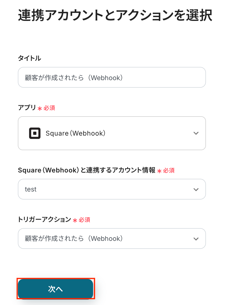 タイトルは任意で変更できます。 アプリとトリガーアクションはあらかじめ設定されているため、そのまま内容を確認してください。 Squareと連携するアカウント情報に問題がなければ、「次へ」をクリックします。