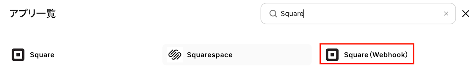 新規接続をクリックしたあと、アプリのメニュー一覧が表示されるのでSquareと検索し対象アプリ「Square(Webhook)」をクリックしてください。