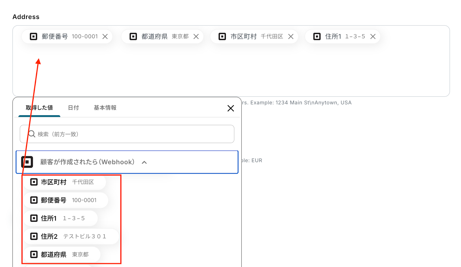 Address クライアントとして登録する顧客の住所を入力しましょう。 こちらも入力欄をクリックすると前のステップでSquareから取得済みのアウトプットが表示されるので、選択して入力してください。