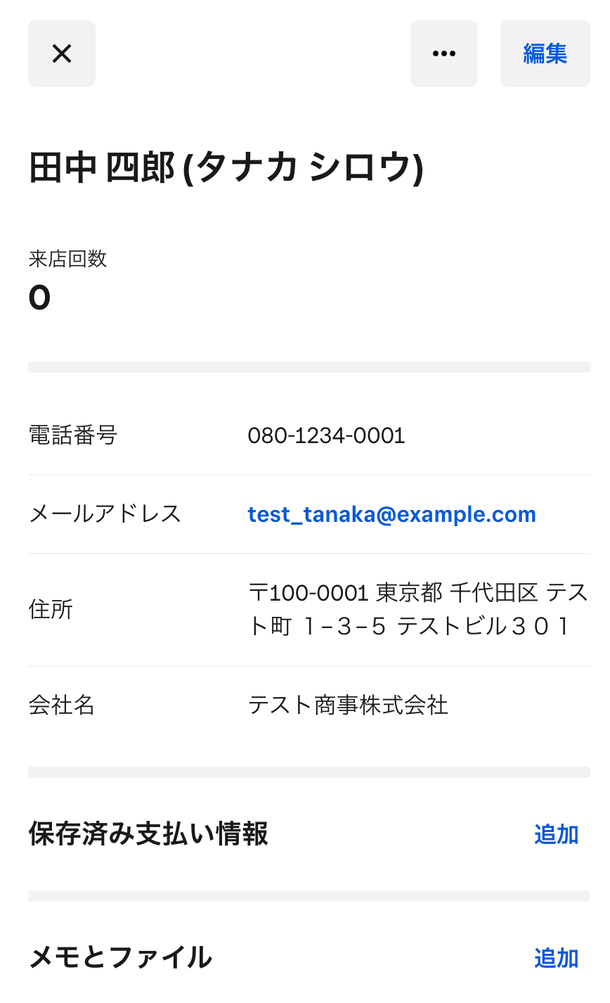 SquareとYoomの連携が完了したら、事前準備としてSquareで顧客を作成しておきましょう。 今回はテスト用に、以下の内容で作成しました。