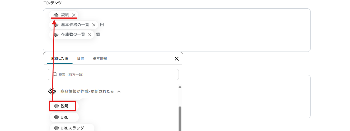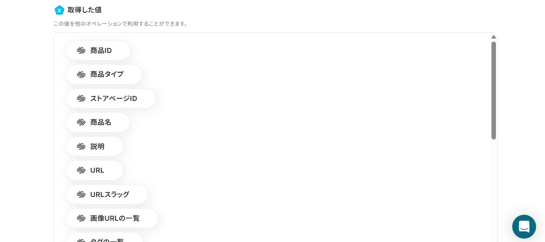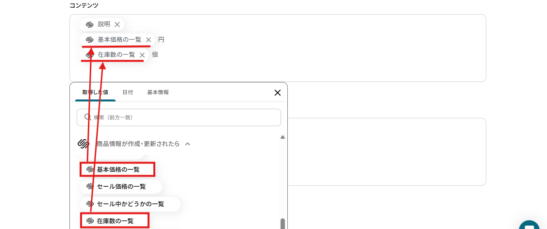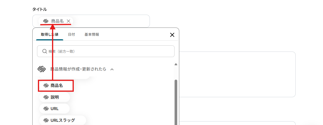 ※取得した値(アウトプット)とは、トリガーやオペレーション設定時に、「テスト」を実行して取得した値のことです。詳しくは、こちらのヘルプページをご確認ください。