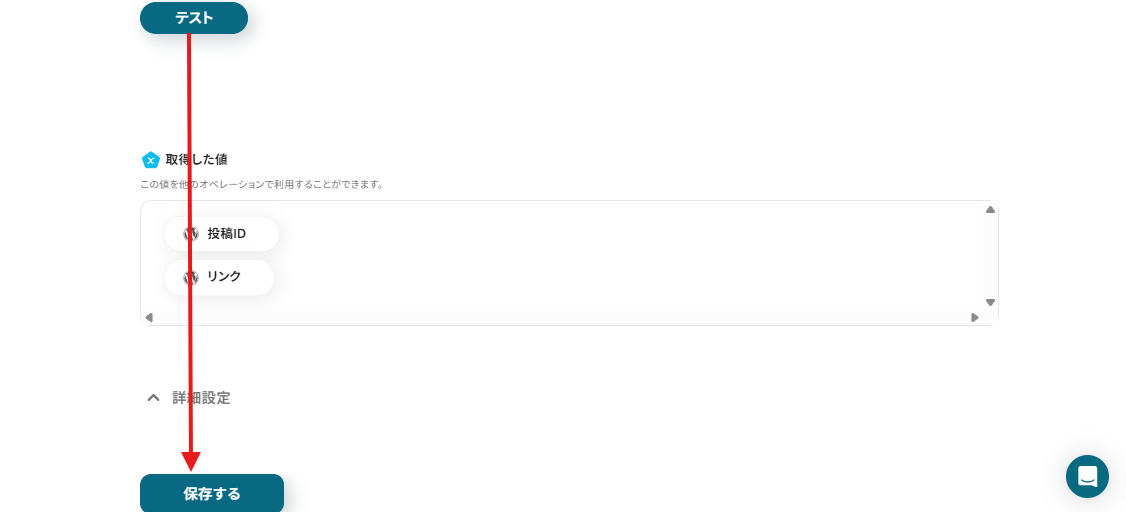 テスト成功後、Squarespaceに先ほど作成した商品情報が取得した値(アウトプット)に表示されるので確認し「保存する」ボタンをクリックしましょう。