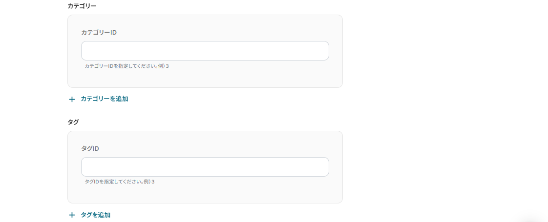 ステップ5の「WordPressに新規投稿を作成する」という項目に、「カテゴリー」と「タグ」を設定できる項目があるので使用したいIDを入力してください。
