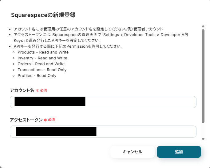 入力できたら「追加」ボタンをクリックしSquarespaceのマイアプリ連携完了です!
